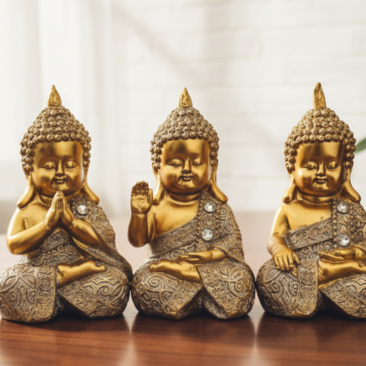 El Set Adorno Buddha Mudras representa tres gestos sagrados del budismo que simbolizan agradecimiento, protección y conexión con la tierra. Estas figuras invitan a cultivar la serenidad interior y a vivir con consciencia, recordándonos aplicar la sabiduría budista en nuestra vida diaria. Más que adornos, son amuletos de energía espiritual que armonizan cualquier espacio del hogar u oficina.