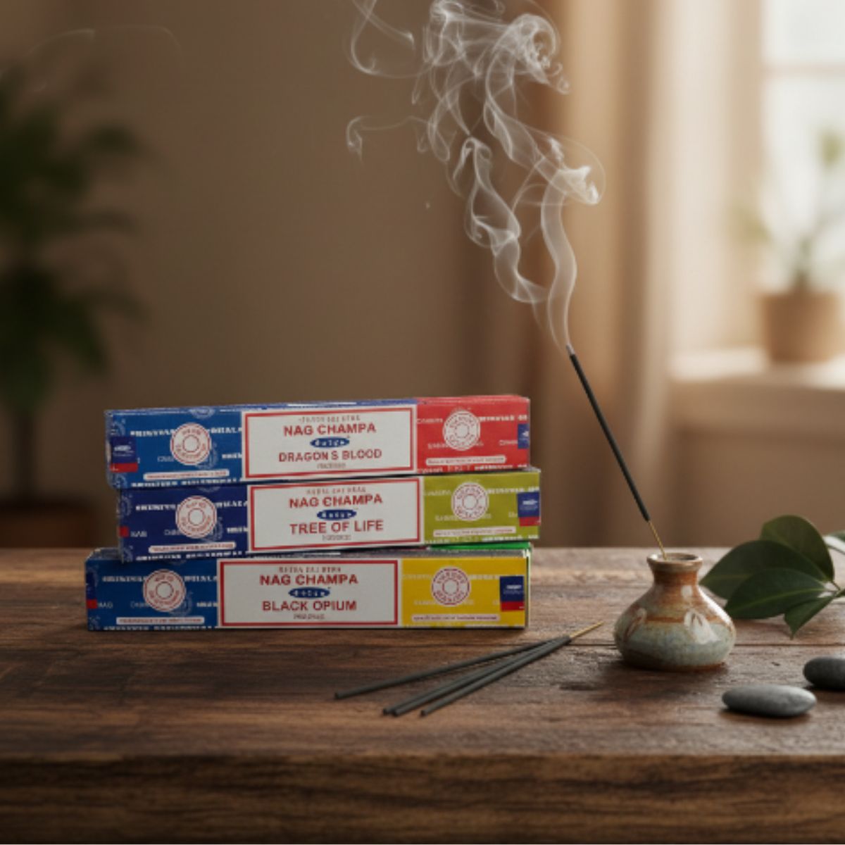 El clásico Nag Champa actúa como base reconocida por su aroma cálido y profundo, ideal para meditación y armonización.