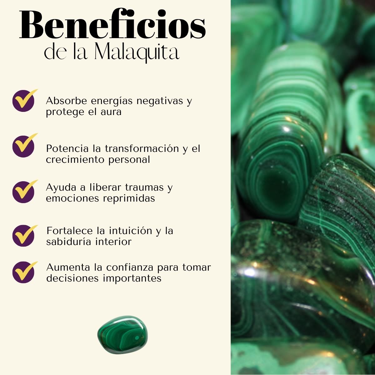 La Malaquita es una piedra protectora que ahuyenta el mal de ojo, las malas energías y la envidia, es la piedra de la transformación, la limpieza y la sanación. Tiene una energía intensa que te ayudará en momentos de ruptura amorosa y de cambios vitales, este mineral transmite equilibrio y elimina los bloqueos ayudándote a estar en calma.
