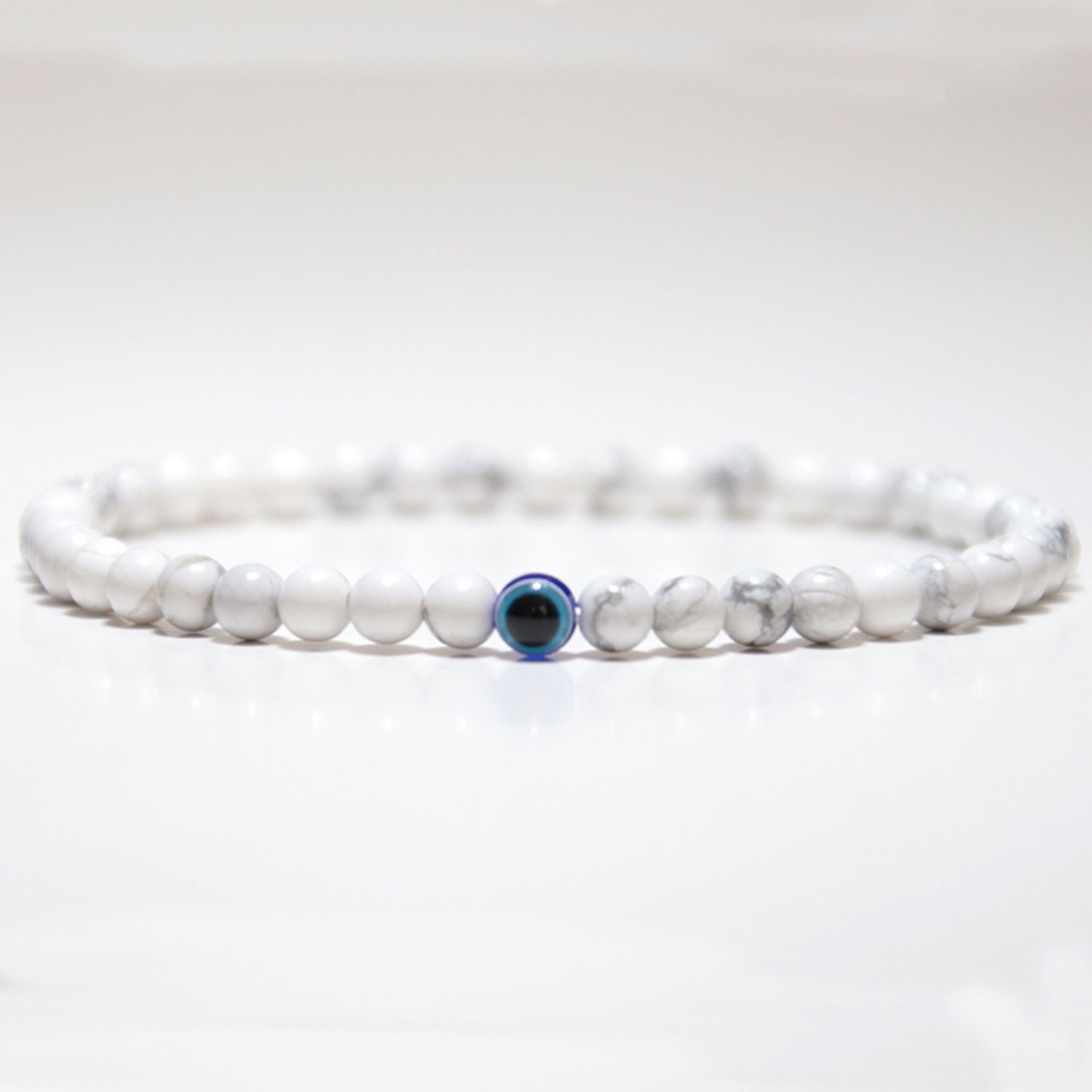 La howlita blanca irradia pureza, equilibrio y serenidad. Su energía promueve la paciencia, el descanso mental y la conexión con la paz interior. El ojo turco azul potencia esta vibración, bloqueando la envidia y el agotamiento emocional, creando un campo protector de armonía.