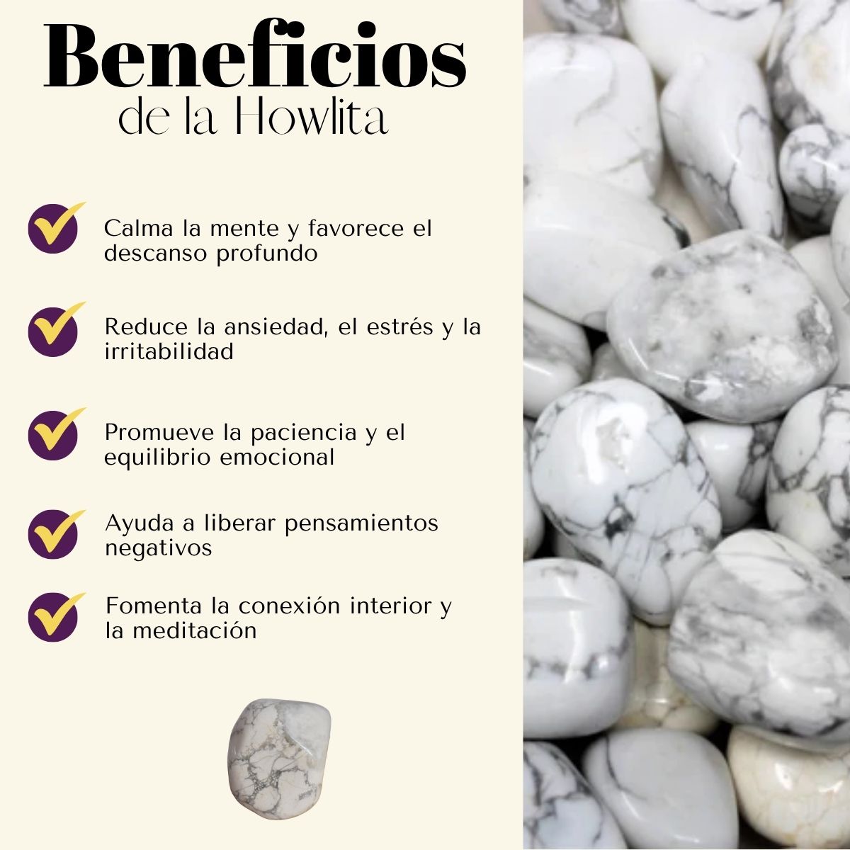 La howlita es conocida por su energía tranquilizadora, ideal para quienes buscan reducir el estrés, la ansiedad y los pensamientos acelerados. El ojo turco azul, símbolo protector ancestral, actúa como escudo frente al mal de ojo y las vibraciones negativas.
