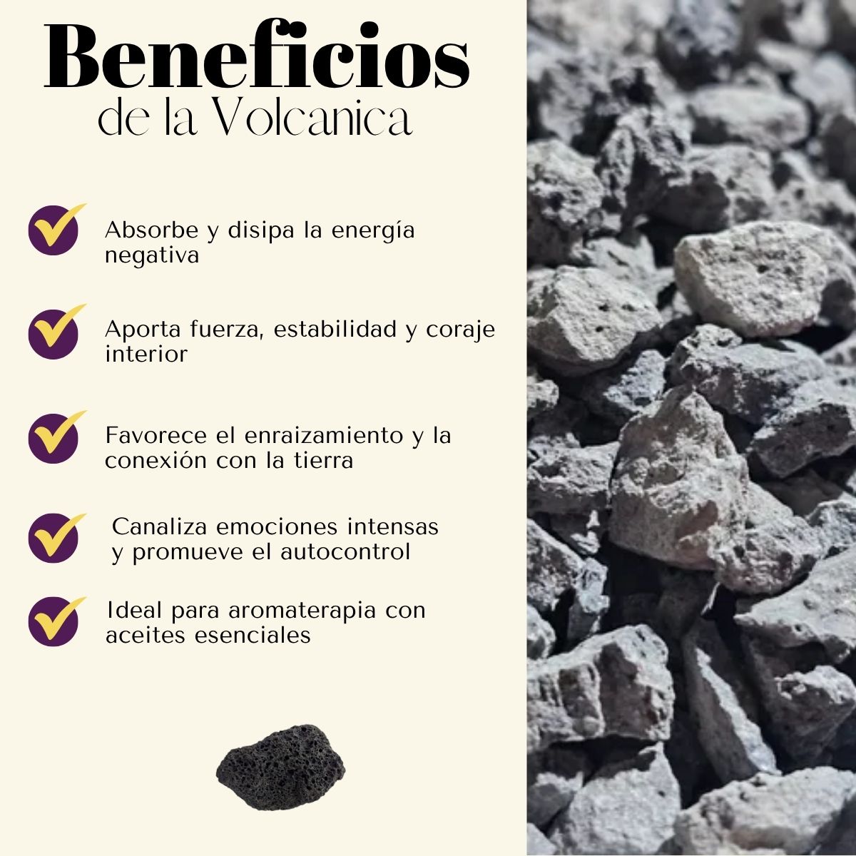 La piedra volcánica —o lava stone— es conocida por su capacidad para absorber, depurar y transmutar energías negativas. Favorece la calma, la claridad interior y los procesos de transformación personal. Además, su superficie porosa permite usarla como difusor natural de aceites esenciales, potenciando su energía y elevando sus beneficios terapéuticos.