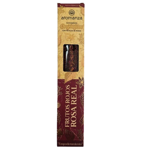 El Sahumerio Orgánico Frutos Rojos Rosa Real de Aromanza ✨ combina la intensidad frutal de los frutos rojos con la delicadeza floral de la rosa real, generando una fragancia única que eleva la vibración del corazón y llena tus espacios de armonía y calidez.