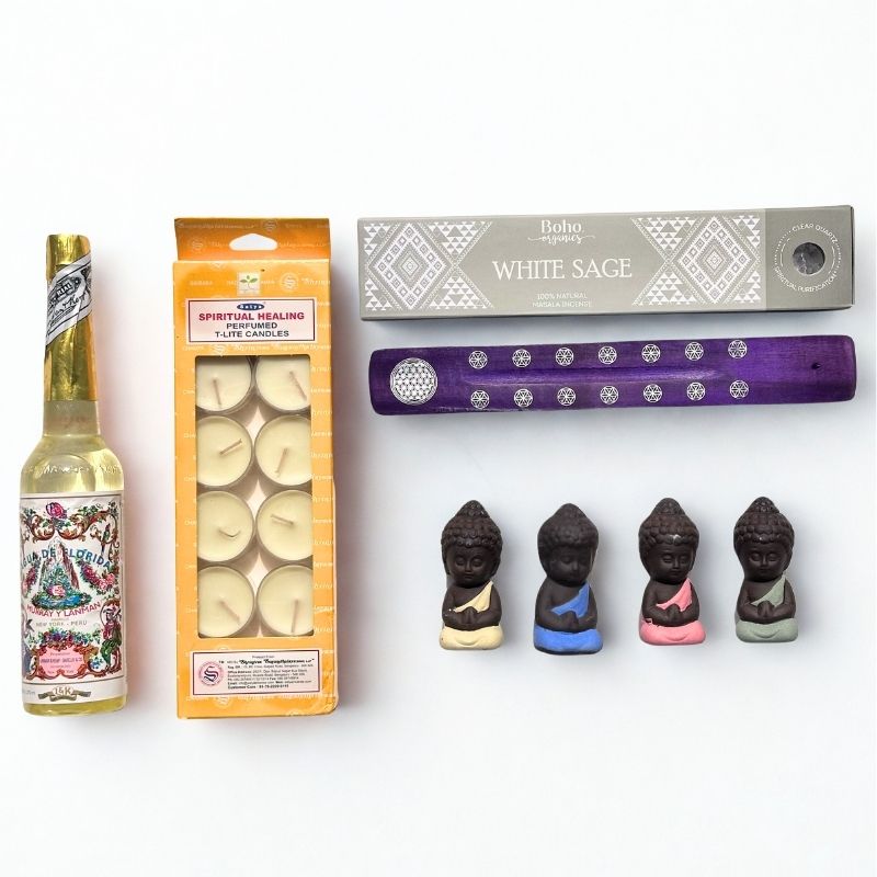 Cada elemento de esta box tiene un propósito: la vela aporta luz y guía espiritual; el porta incienso y los inciensos ayudan a purificar y elevar la vibración del espacio; las figuritas de Buda simbolizan paz, sabiduría y protección; mientras que el Agua Florida limpia y armoniza la energía del ambiente. Con este set, tendrás todo lo necesario para comenzar a crear tu altar con intención.