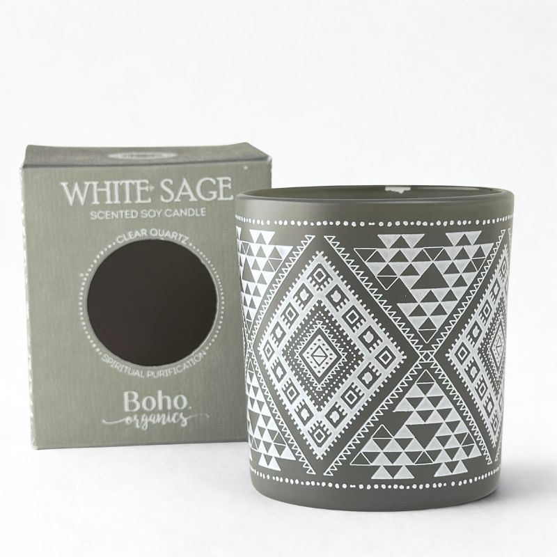 Vela Boho Salvia Blanca con Piedra Cuarzo Cristal, una fragancia pura y armonizadora que limpia, equilibra y eleva la energía de tus espacios, conectándote con la luz interior y la serenidad espiritual.