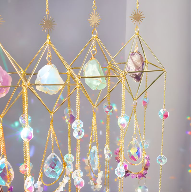 Cada rayo de sol que atraviesa sus cristales facetados se convierte en un arcoíris que ilumina el espacio, promoviendo calma, protección y conexión espiritual.
