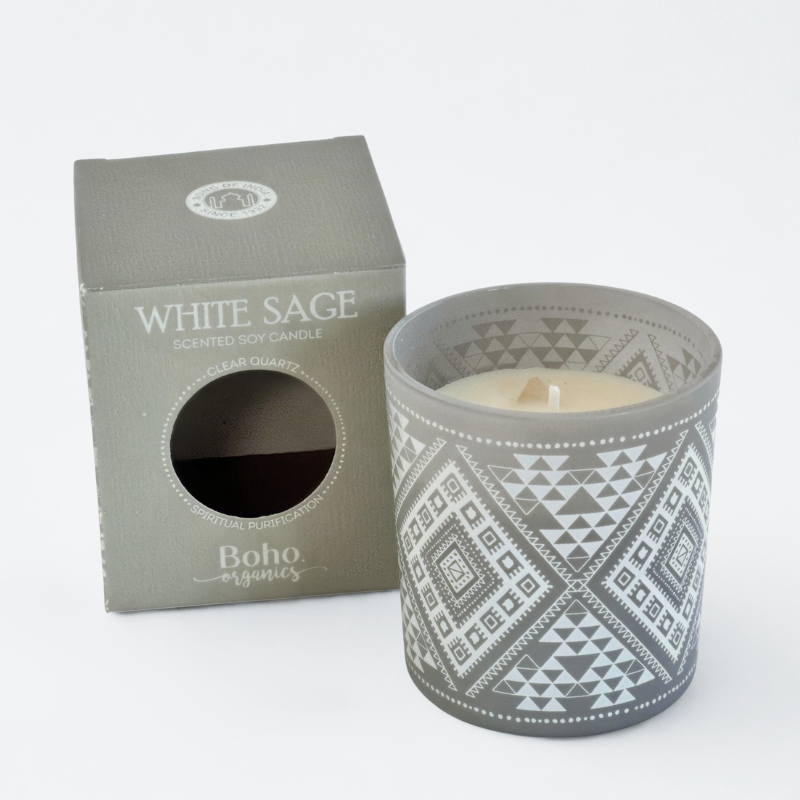 – Vela Boho Salvia Blanca con Piedra Cuarzo Cristal 120 g
