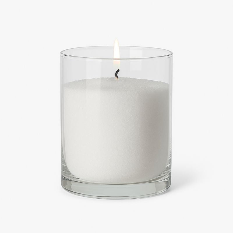 El vidrio claro representa transparencia, limpieza y fluidez, actuando como un canal que amplifica la energía de la vela.