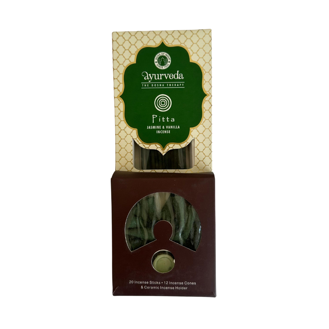 Este set de inciensos en varilla y cono está cuidadosamente formulado para armonizar la constitución psicofísica y estimular el prana (fuerza vital). El incienso está preparado con una mezcla de hierbas, raíces, resinas, esencias aromáticas y otros elementos naturales, utilizados tradicionalmente en la medicina ayurvédica.