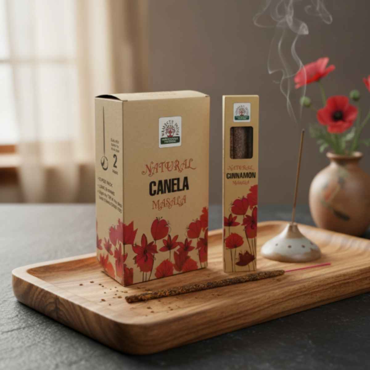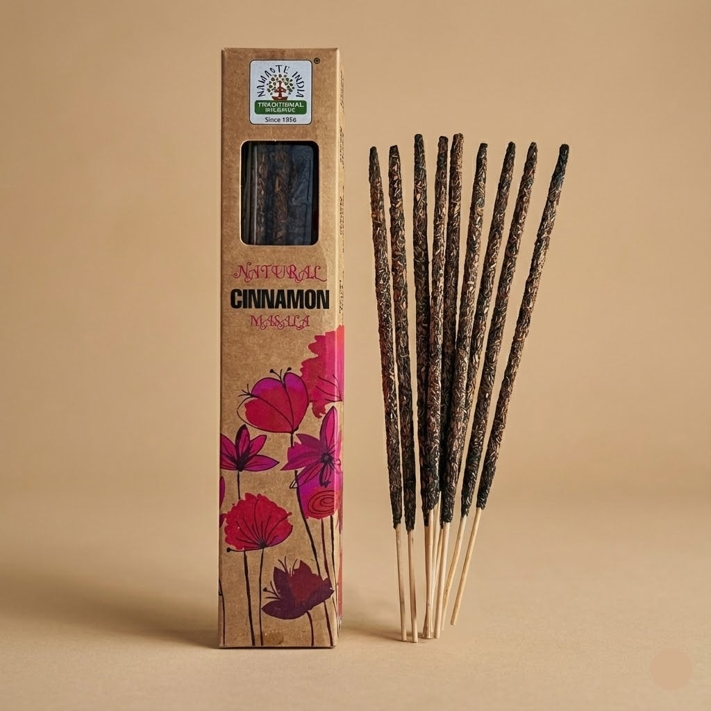 Namaste India – Incienso Orgánico Canela, una fragancia pura y energética que eleva el espíritu, armoniza tus espacios y envuelve el ambiente con la calidez reconfortante de la canela natural.