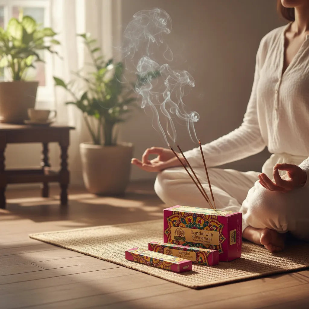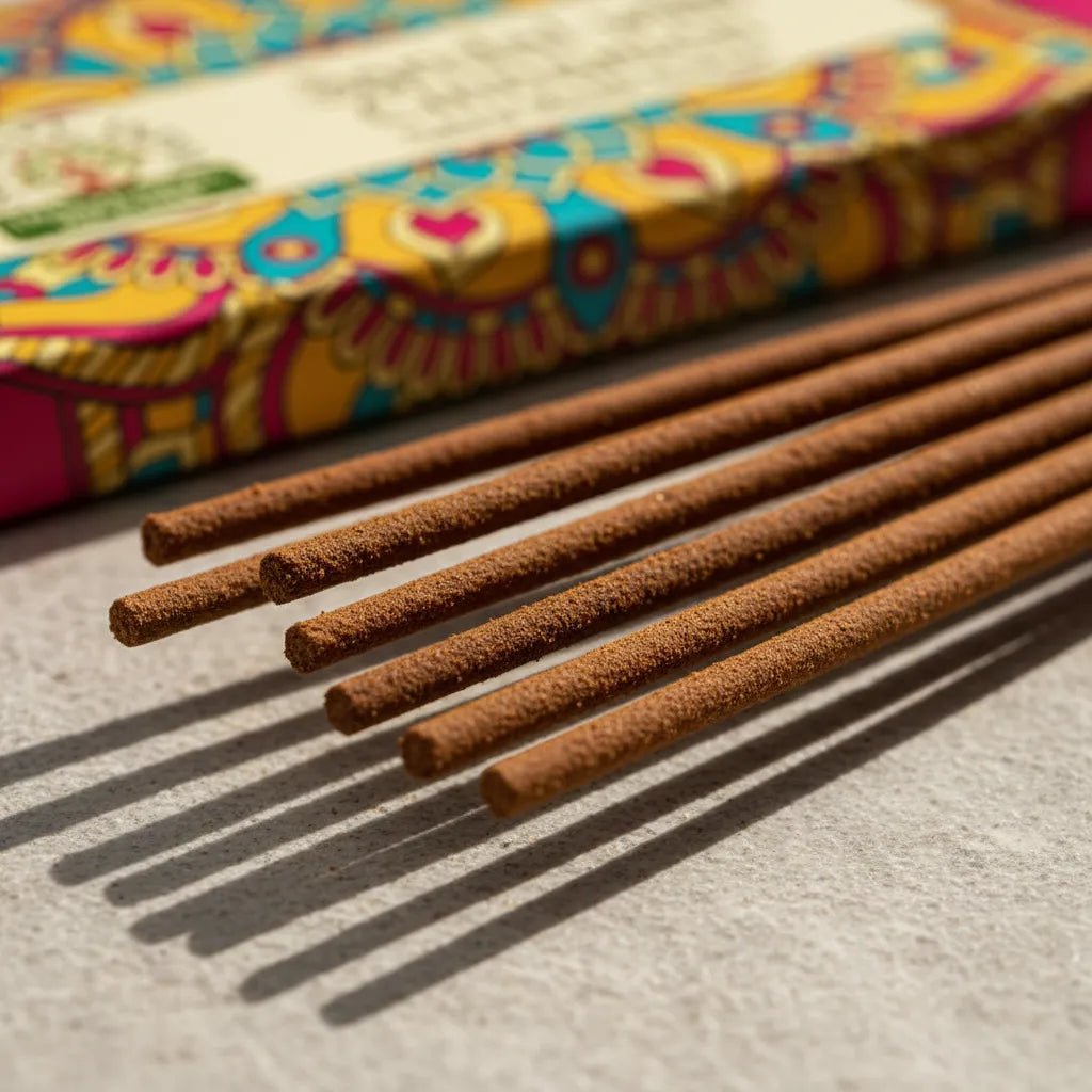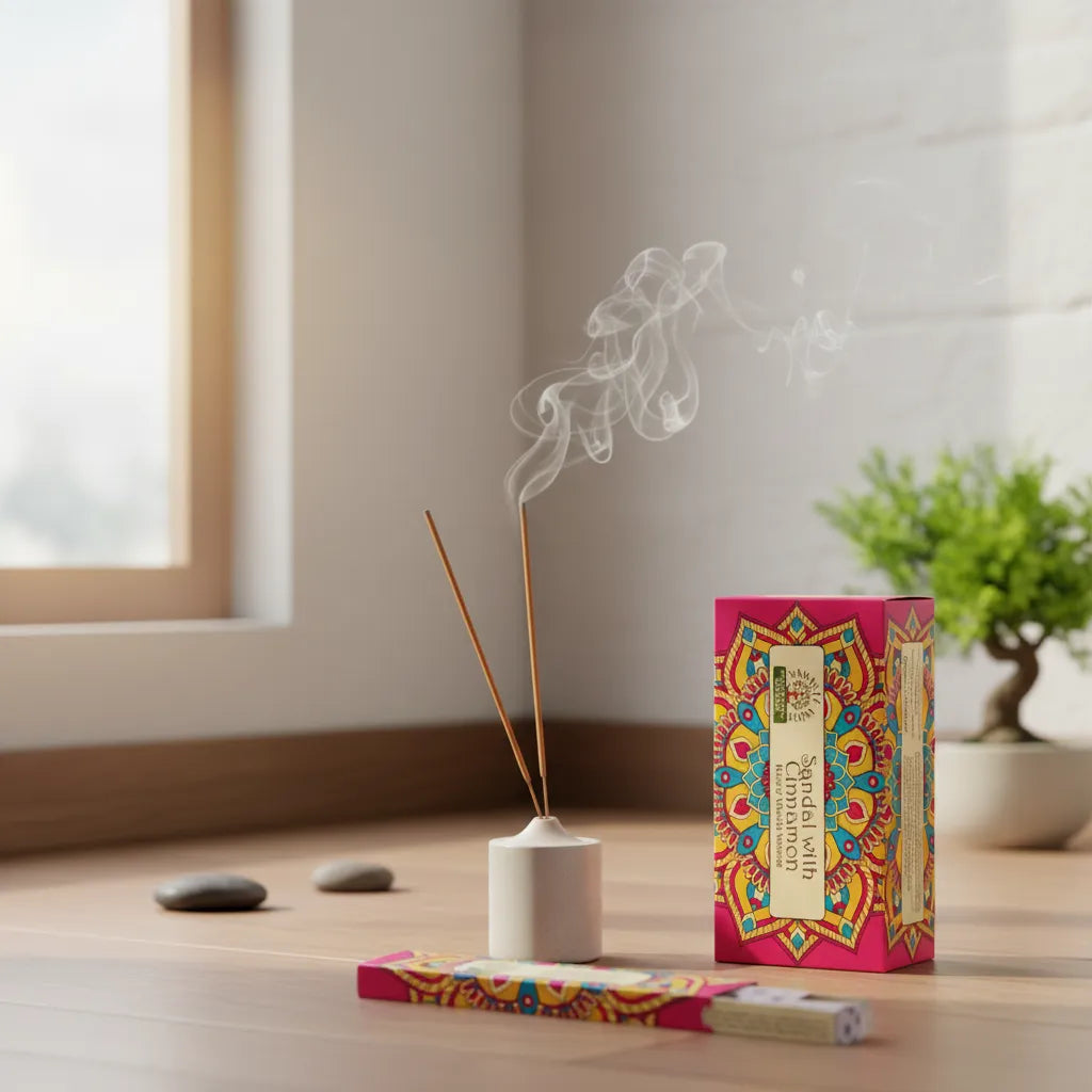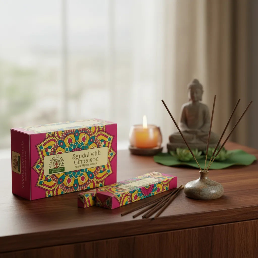 Namaste India – Incienso Sándalo con Canela, una fragancia cálida y espiritual que equilibra cuerpo y mente, purifica la energía y atrae bienestar, prosperidad y armonía a tus espacios.