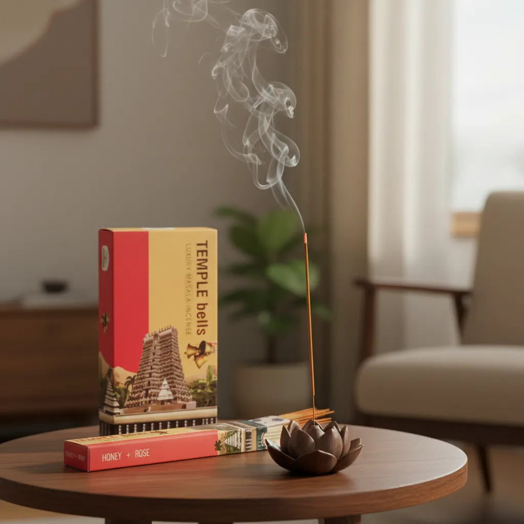 Namaste India – Incienso Temple Bells Rosa + Miel, una fragancia dulce y armonizadora que eleva el espíritu, despierta el amor y llena tus espacios de paz, dulzura y energía positiva.