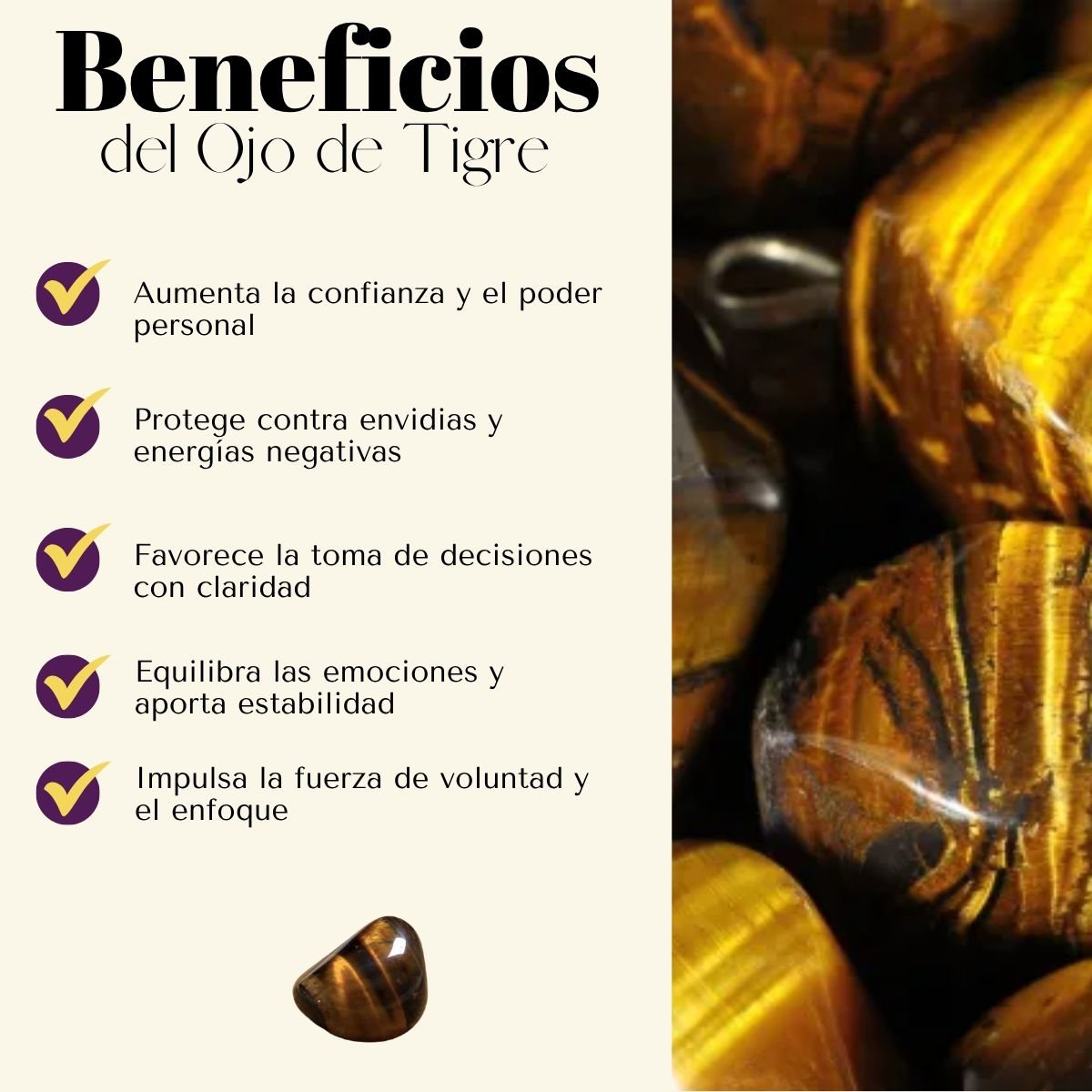 El ojo de tigre tiene propiedades que permiten alejar las energías negativas y atrae las positivas. Excelente amuleto para atraer prosperidad. Ayuda a aumentar la confianza y eliminar los miedos y indecisiones.