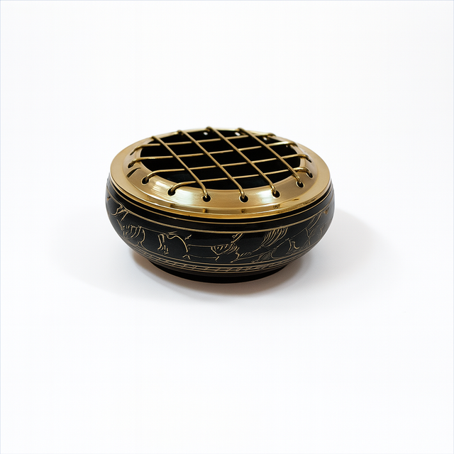 Diseño grabado artesanal – Acabado negro elegante – Elaborado en bronce – Ideal para resinas y copitas – Combustión segura con carbón vegetal – Hecho en India