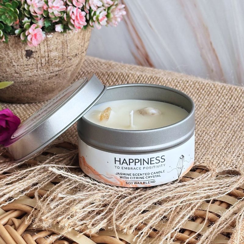 Llena tus días de alegría y energía positiva con la Vela Perfumada Crystal Energy Felicidad, una creación artesanal diseñada para iluminar tus espacios con optimismo, bienestar y armonía. Elaborada con cera de soya y palma natural, libre de toxinas y de origen sostenible, esta vela combina el poder vibrante de los cristales con la delicadeza de las flores para elevar la frecuencia emocional y mental.